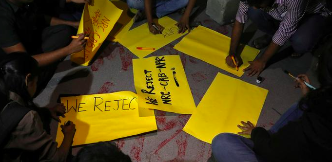 Students write posters against NPR, CAA and NRC in Kolkata. Photo: Reuters
