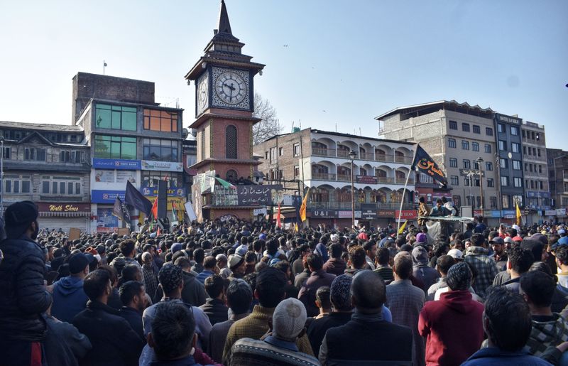 Witnesses said that the historic Lal Chowk in the summer capital Srinagar was flooded by demonstrators since Sunday morning after the news of Khamenei's killing in an airstrike last night was confirmed by the Iranian state media.