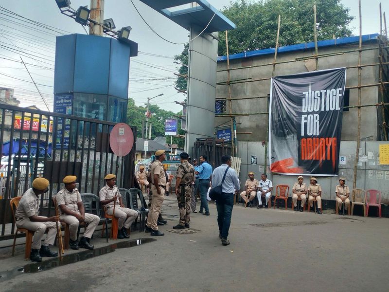 Two Kolkata Police officials could be seen guarding the entrance of the emergency ward which was severely vandalised on August 15. At every department entrance throughout the premises are either CISF or police officials.