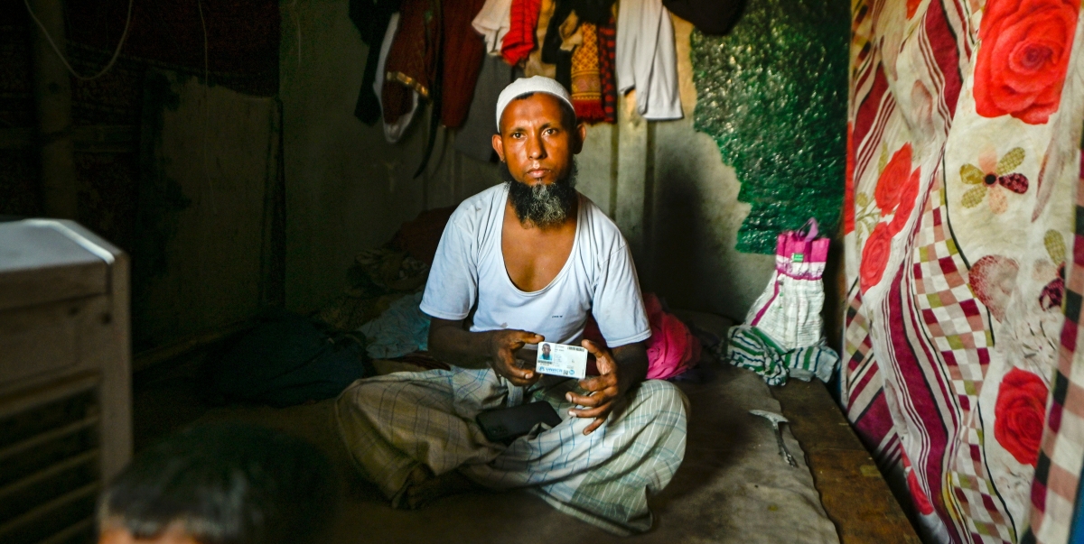 Kabir Ahmed showes his UNHCR ID card at the Rohinya refugee settlement area in Kalindi Kunj, New Delhi, August 17, 2022. Photo: PTI/Ravi Choudhary