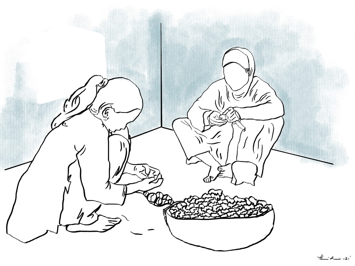 Mariam’s father, Junaid, was a singer and a tabla player. “Have you seen a tabla? It is a set of two drums with a leather membrane over it. Like this,” Ayesha, Mariam’s ten-year-old sister, explains by putting a polybag membrane over the recycled paint bucket Mariam was using to store the walnut kernels. The bucket topples and the kernels spill on the ground. Tabla is a common classical musical instrument in the Indian subcontinent.