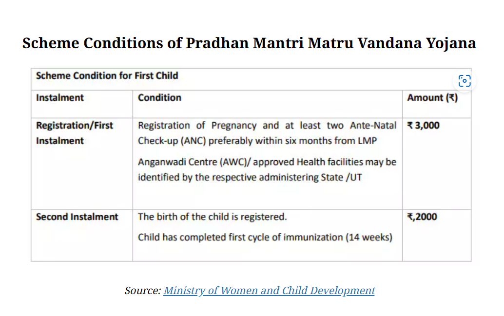 The Pradhan Mantri Matru Vandana Yojana was initiated in 2017 as per provisions under the National Food Safety Act, 2013, and provides financial support of Rs 5,000 for pregnant women and lactating mothers during the first pregnancy, as compensation for partial wage loss, and to improve the wellbeing and health-seeking behaviour of the mother and child.