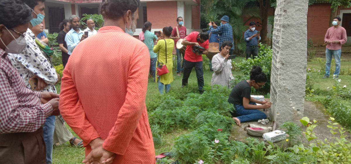 Stan Swamy's name being engraved in the stone list of martyrs. Photo: Author provided