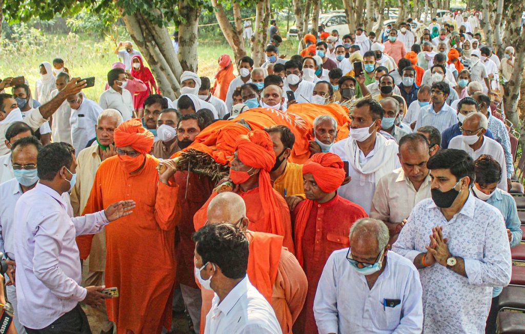 Supporters, relatives and followers of Swami Agnivesh during his funeral procession near Agni Yog Ashram in Gurugram district, September 12, 2020. Photo: PTI