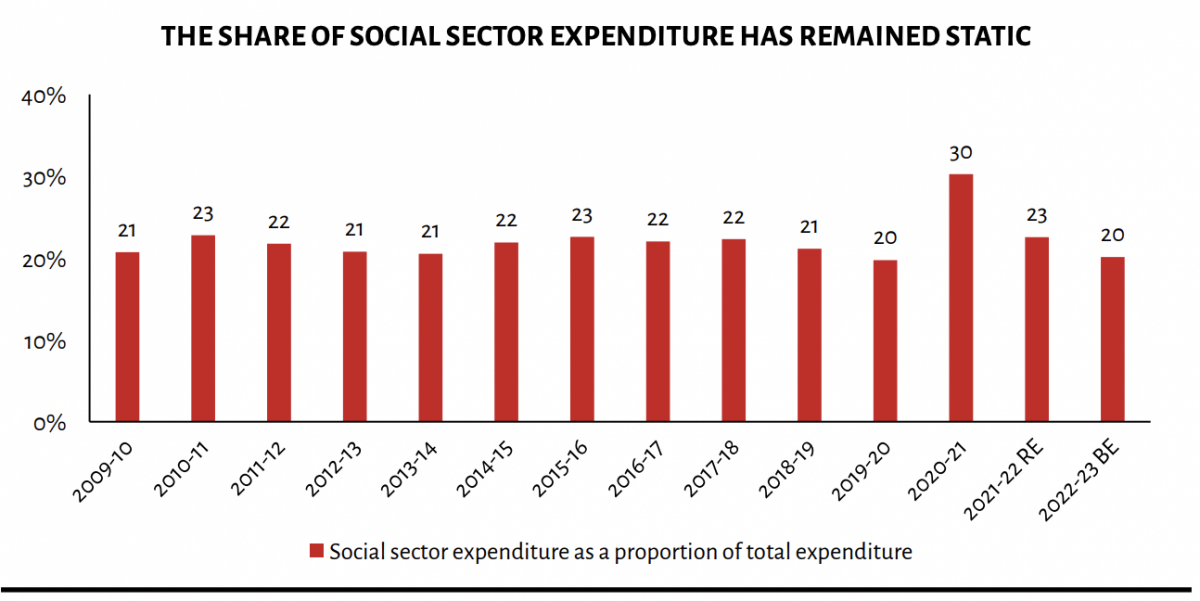 It is important to note that GoI spends only a fifth of its total expenditure on the social sector. State governments, conversely, devote a higher share to social sector spending. In FY 2020-21, 41% of states’ expenditure was on the social sector. It is budgeted to be 42% in FY 2022-23 BEs and is expected to be at a similar level in FY 2021- 22 REs.