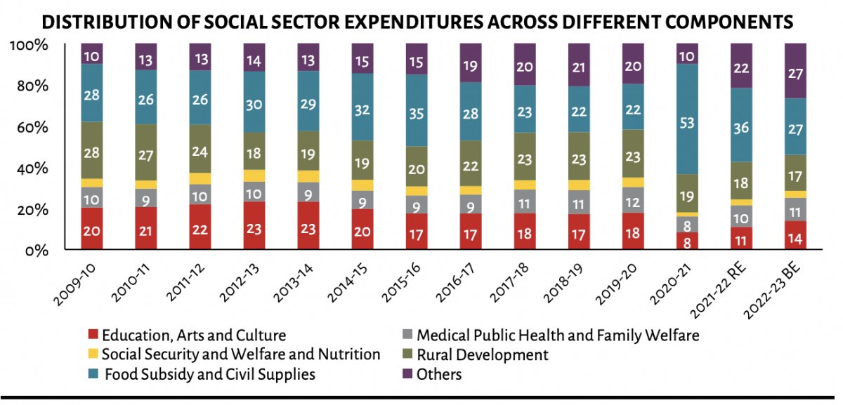 As can be seen in the graph on the next page, in terms of the share of social sector expenditure across different components apart from Food Subsidy, the other priority areas between FY 2009-10 and FY 2019-20-23 have been rural development (especially the employment guarantee scheme MGNREGS) at 21%, and education (mostly free education for all children, and including art and culture) at 16%.