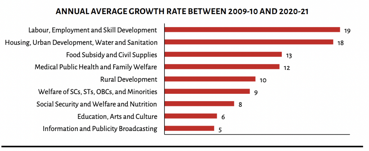 Another metric to see trends in expenditure across development areas is by studying the average annual growth rate during the same period. At the aggregate level, social sector expenditure grew at 11% annually between FY 2009-10-11 and FY 2020-21. Development heads that grew at a faster pace included Labour, Employment and Skill Development (19%); Housing, Urban Development, Water, and Sanitation (18%); Medical and Public Health and Family Welfare (12%); and Food Subsidy and Civil Supplies (13%).