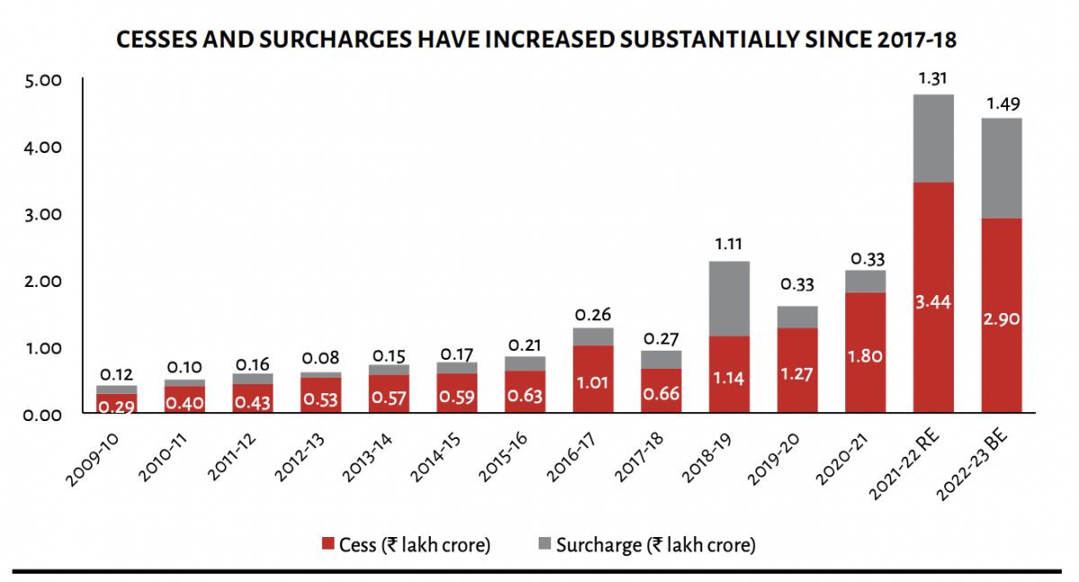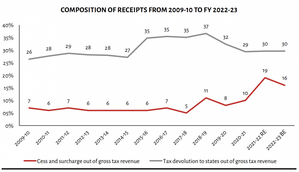 While GoI has the sole authority to collect a larger share of taxes, the same is to be shared among itself and state governments by applying a formula recommended by the Finance Commission of that period. The share of cess and surcharges in the gross tax revenue of the Union government has gone up from between 5% and 7% in general, to between 15% and 20% in recent years. But the impact of high cess and surcharges is visible in the flattening of states’ share in recent years.
