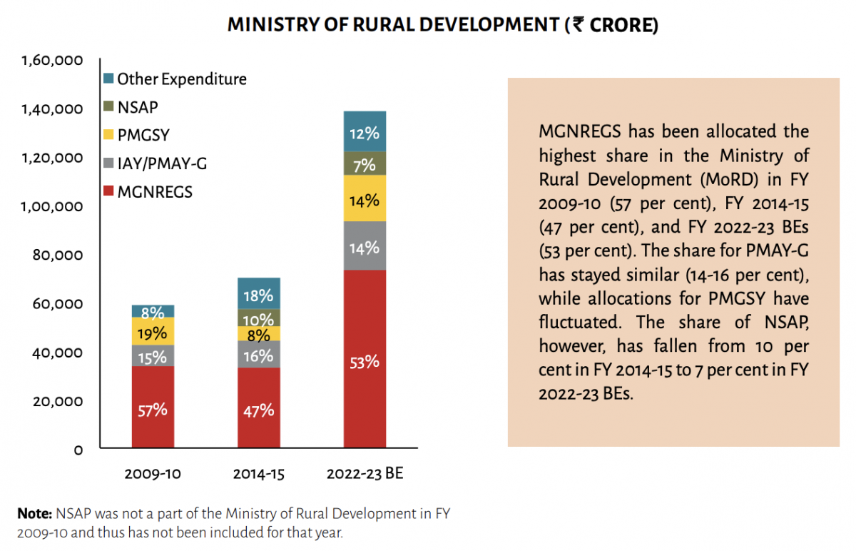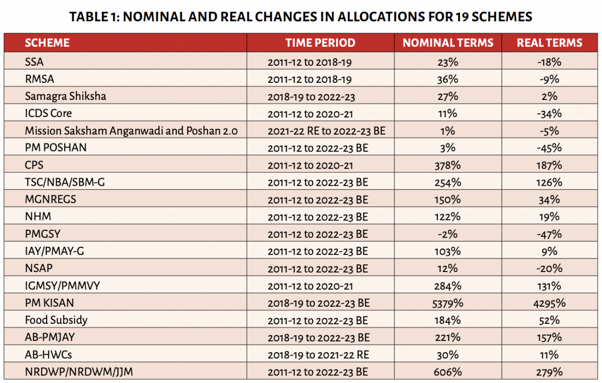 In nominal terms, allocations for every scheme have increased, except for the Pradhan Mantri Gram Sadak Yojana (PMGSY). In fact, allocations doubled for 10 schemes: Child Protection Services (CPS), Swachh Bharat Mission – Gramin (SBM-G), Mahatma Gandhi National Rural Employment Guarantee Scheme (MGNREGS), National Health Mission (NHM), Pradhan Mantri Awas Yojana – Gramin (PMAY-G), Pradhan Mantri Matru Vandana Yojana (PMMVY, erstwhile Indira Gandhi Matritva Sahyog Yojana), Pradhan Mantri Kisan Samman Nidhi (PM KISAN), Food Subsidy (FS), Ayushman Bharat - Pradhan Mantri Jan Arogya Yojana (AB-PMJAY), and the Jal Jeevan Mission (JJM).