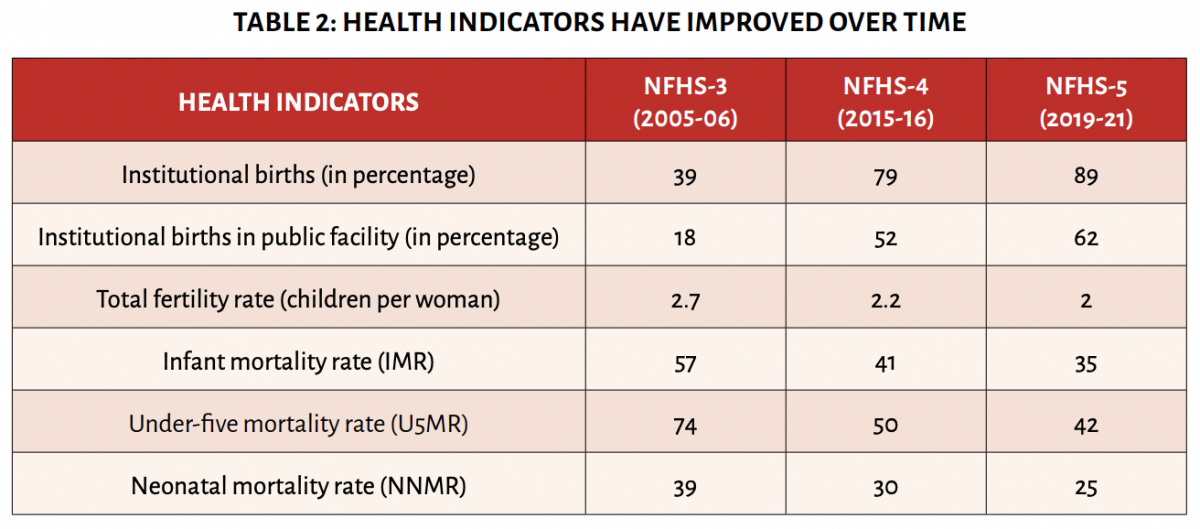 The country has seen significant improvements in institutional births during this period from 39 per cent (2005-06) to 89 per cent (2019-21). A large proportion of the increase in institutional delivery has come from public facilities, having increased from 18 per cent in 2005-06 to 62 per cent in 2019-21.