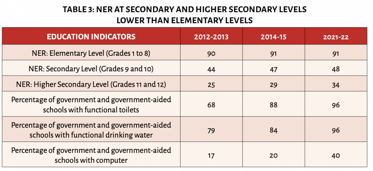 At the secondary level (Grades 9 and 10), the NER has consistently increased from 44 per cent in FY 2012-13 to 48% in FY 2021-22. Contrary to the NER in 2021-22, the Gross Enrolment Ratio (GER) in the same year stood at 80%. This implies that a high proportion of students enrolled in secondary level are enrolled in a learning grade that is different to their age.