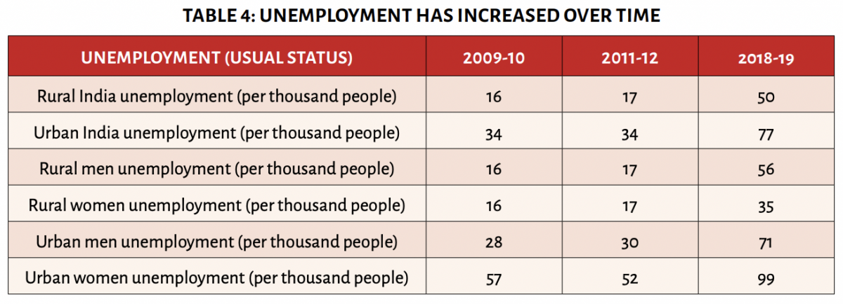 Rural unemployment increased to 50 per thousand people in 2018-19 from 17 per thousand people in 2011-12, whereas urban unemployment increased to 77 per thousand people in 2018-19 from 34 per thousand people in 2011-12.