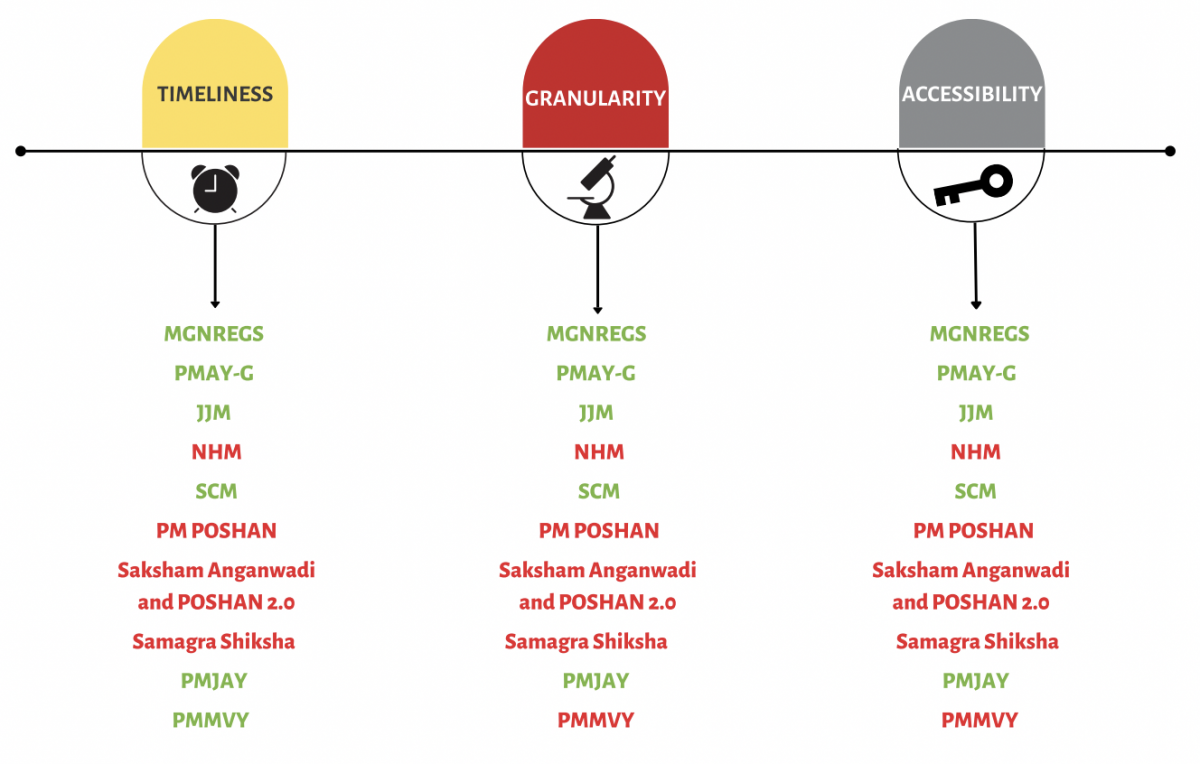Timeliness, granularity and accessibility are three measures of unpacking how efficient an open data MIS is. An MIS is considered timely if it publishes data in real-time. Further, granularity helps us understand the disaggregation of the data across different tiers of the government. Lastly, accessibility helps us understand whether the data can be accessed offline through downloads in convenient formats such as PDF or Excel files. In the visual below, we have characterised the MIS of various schemes as red if the scheme performs poorly on the three metrics mentioned above and green if it performs well.