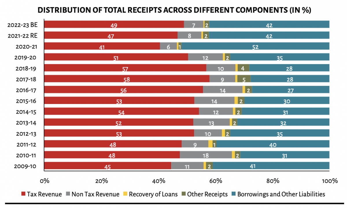 From FY 2009-10 to date, tax revenues and borrowings have formed the largest share in GoI’s Total Receipts. In FY 2009-10, as much as 45% of Total Receipts were from tax revenue, which increased to 58% in FY 2017- 18. Since then, however, the share of tax revenue has been declining, and it has necessitated higher borrowing in subsequent years. Share of tax revenue in Total Receipts was the lowest during the COVID-19 pandemic period, at 41% in FY 2020-21, when borrowings accounted for 52%. As the economy recovers and revenues become more buoyant, the share of borrowings was expected to decline to 42% in FY 2022-23 BEs, similar to FY 2009-10 levels.
