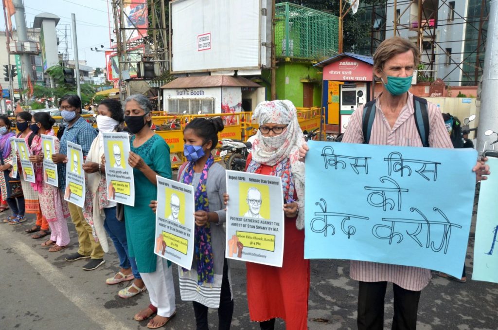 Social activists hold a protest after the arrest of Father Stan Swamy by the NIA in the Bhima Koregaon case, in Ranchi, October 9, 2020. Photo: PTI