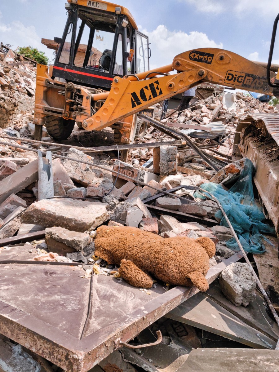 A torn teddy bear lies on a demolished door in front of a bulldozer in Khori Gaon. | Photo: Naomi Barton