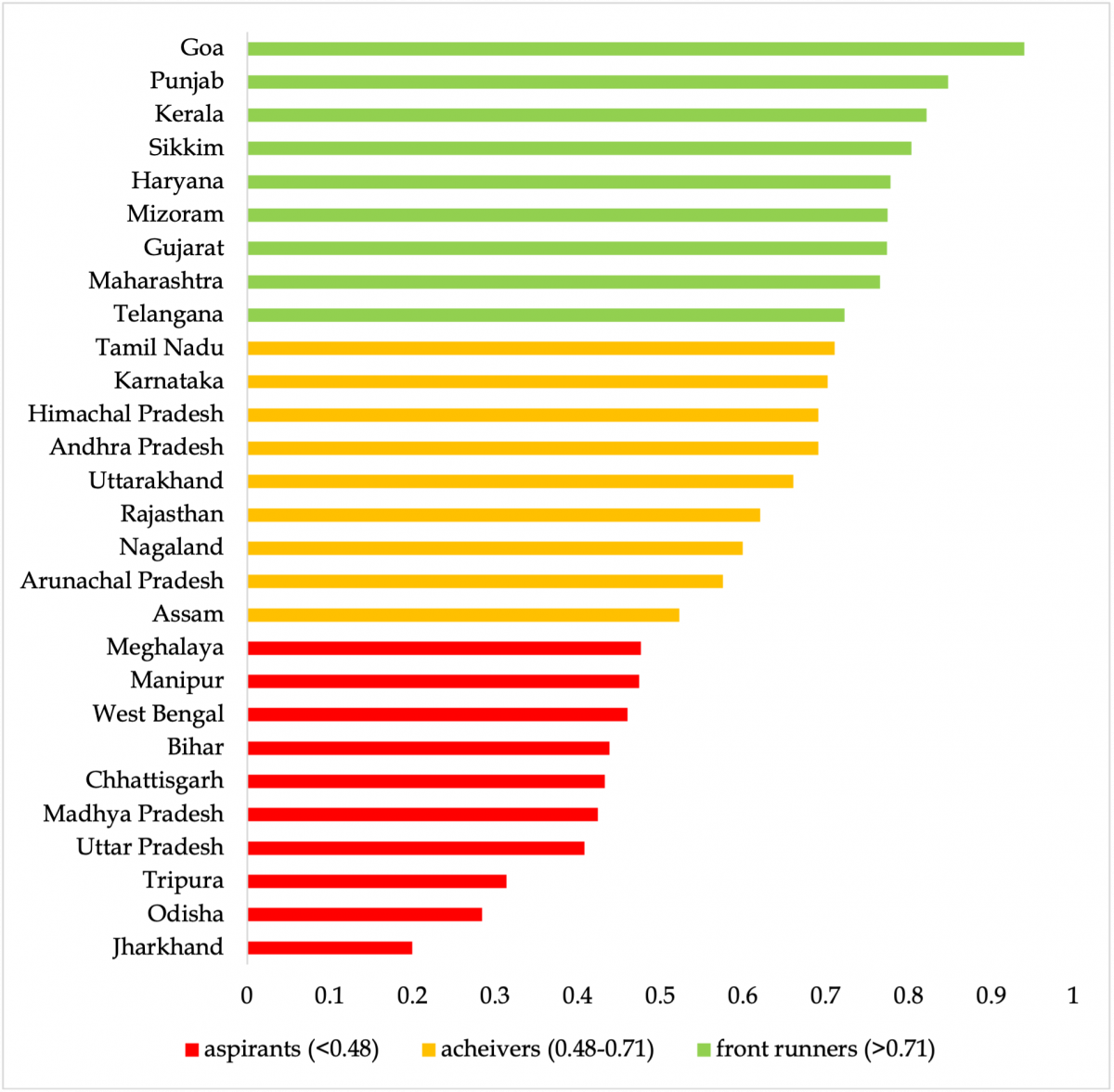As seen in Figure 1 below, Goa followed by Punjab, Kerala, Sikkim, Haryana, Mizoram, Gujarat, Maharashtra and Telangana are front runners (index value > 0.71) owing to the fact that the basic amenities in terms of drinking water, sanitation, housing, clean energy, nutrition and digital access out-par other states in India.
