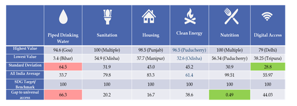 Goa’s high score is driven by a high score across access to drinking water, functional toilets, good quality housing, clean fuel, food through PDS and the internet. The index values for achievers lie between 0.52-0.71. On the other hand, aspirants including Jharkhand, Odisha, Tripura, Uttar Pradesh, Madhya Pradesh, Chhattisgarh, Bihar, West Bengal, Meghalaya and Mizoram have underperformed.