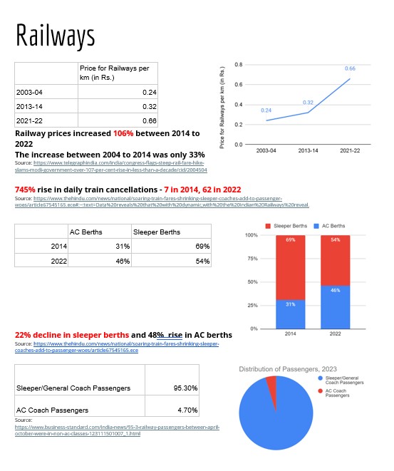 Similarly, the table on Railways despite all the ongoing rhetoric of Vande Bharat Expresses and Bullet trains, tells us a story of how it is increasingly being snatched away from the common people, with a sharp reduction in sleeper berths, a relentless increase in train fares and skyrocketing instances of train cancellations.