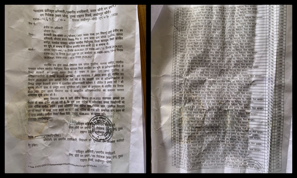 On June 7, 2022, 341 village residents got a notice from the court authorised officer, the divisional forest officer, North Kheri Forest Division, and the deputy director, Buffer Zone, Dudhwa National Park. Only after they received this notice did they learn that proceedings for their eviction are underway in the court at Dudhwa Tiger Reserve, Lakhimpur Kheri, under Eviction Case No. 21 Dhaurhara/2021 Uttar Pradesh State (Forest Department).
