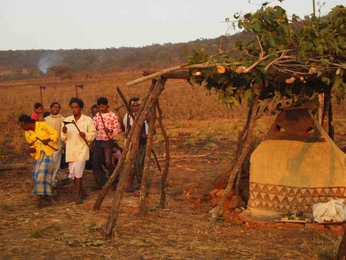 NSS activists dance with their traditional axes as part of the annual festival to pay tribute to Niyamraja, a Kondh deity of universal law who they believe is embodied in the Niyamgiri hills. February 2011.