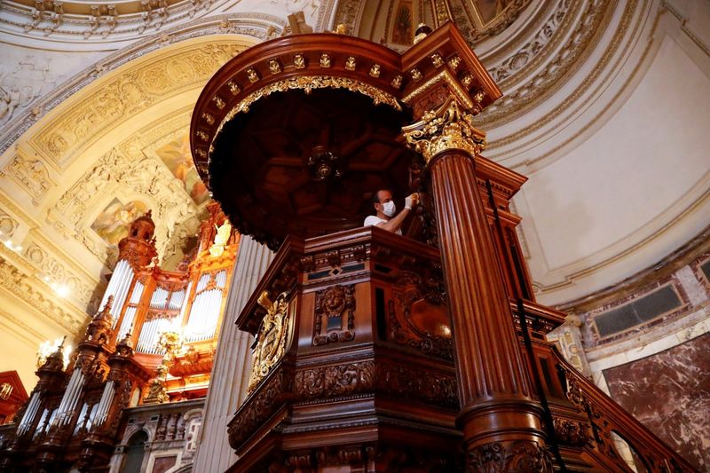 Joseph Saliba, a Syrian migrant of Christian background works with wood in a workshop inside the Berlin Cathedral in Berlin, Germany, August 3, 2018. Credit: REUTERS/Fabrizio Bensch