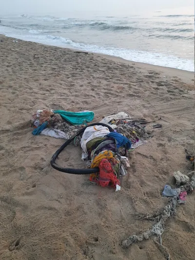These last few mornings, we have been noticing a lot of trash on the beach. This was not the usual beach litter that the river flood brings in and that the northerly distributed equally along the tide line. This trash was in patches. The intertidal sea too was a patchwork of clear water interspersed with littered water and sections that were thick with cycle tyres, twisted fabric, and plastic litter large and small – from bottles, used injection syringes to small packaging and empty, sea-worn convenience sachets of pickles, coconut oil and spice powders. I stepped into the water to get a closer look at the suspended trash; a torn lungi and several polybags affectionately wrapped themselves around my ankle. I had to drag them ashore to untwist and discard them, and then peel off an empty one rupee sachet of Clinic Plus that wanted to go home with me.