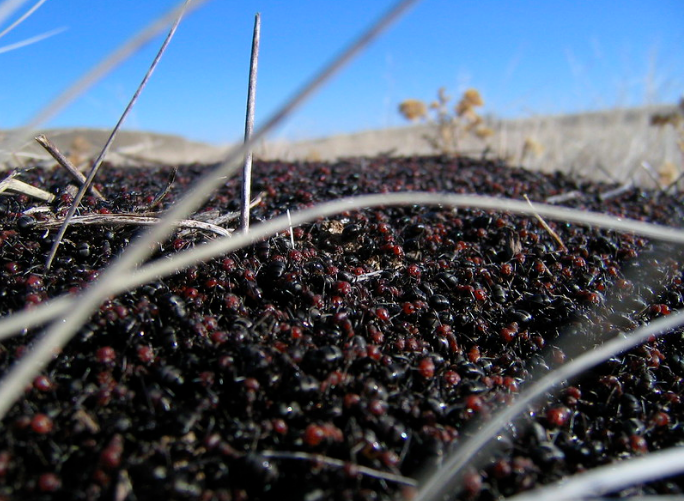 Every morning, the shape of the colony’s foraging area changes, like an amoeba that expands and contracts. No individual ant remembers the colony’s current place in this pattern. On each forager’s first trip, it tends to go out beyond the rest of the other ants travelling in the same direction. The result is in effect a wave that reaches further as the day progresses. Gradually the wave recedes, as the ants making short trips to sites near the nest seem to be the last to give up.