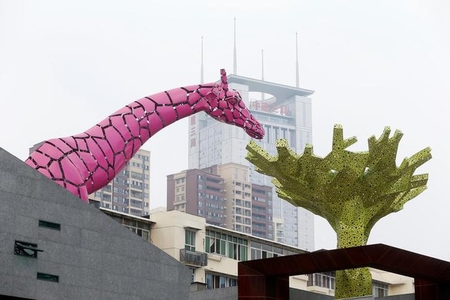 Decorations of a giraffe and a green plant are seen installed at a metro station in Wuhan, Hubei Province, China, May 10, 2016. Credit: China Daily/via Reuters