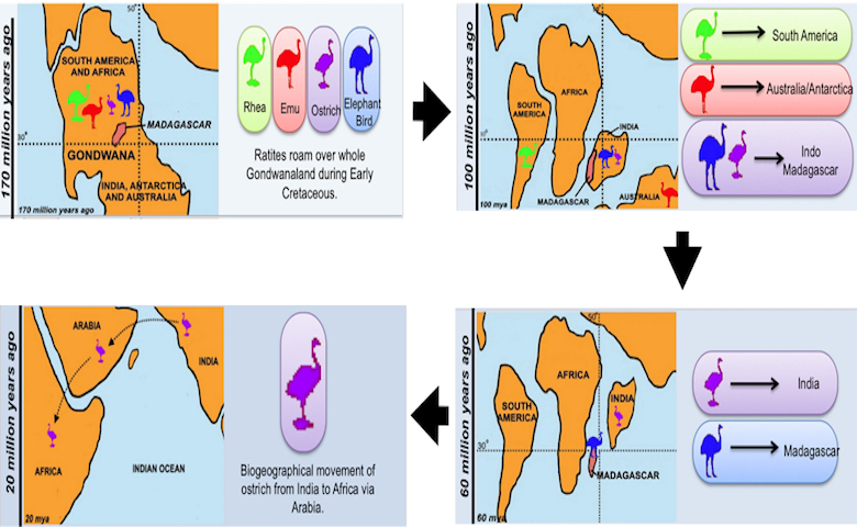 One hundred million years ago, the splitting of the supercontinent Gondwanaland scattered flightless birds across the landmasses: Rheas in South America, emus in Australia-Antarctica and ostriches and elephant birds in Indo-Madagascar. When India later split from Madagascar and slammed into Asia, ostriches hitched along and lived in the sub-continent for a while, before trekking across Eurasia into Africa. Much later, about 60000 years ago, they may have also made their way back to India.