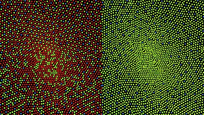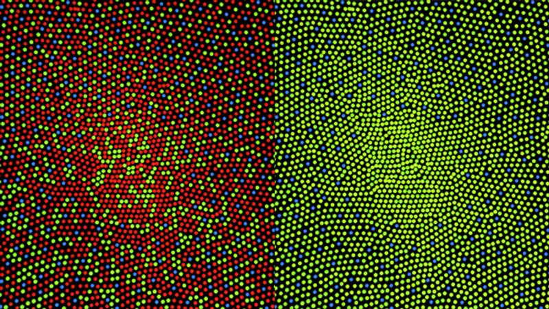 Illustration of the distribution of cone cells in the fovea of an individual with normal color vision (left), and a color blind (protanopic) retina. Credit: Wikipedia