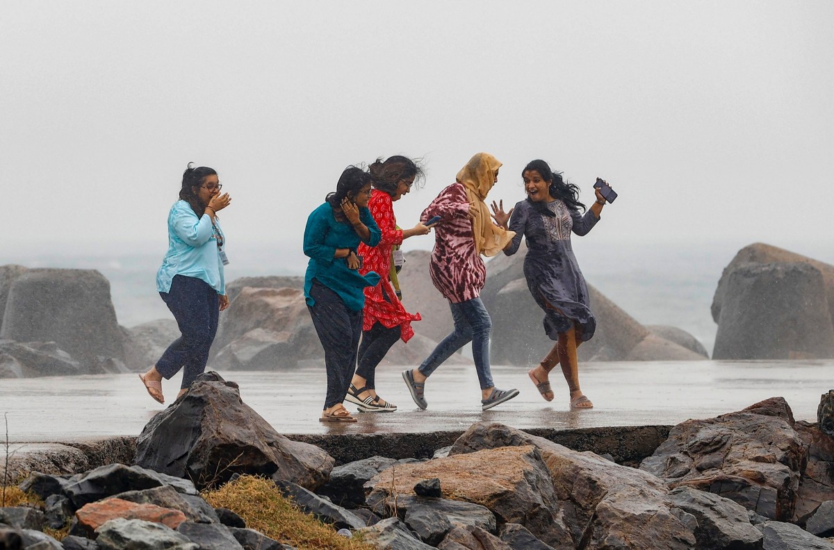Young women react as sea waves crash at the sea-shore ahead of the landfall of cyclonic storm Mandous, in Chennai, Thursday, Dec. 8, 2022. Heavy rainfall is predicted across Tamil Nadu, Puducherry and south of Andhra Pradesh as cyclone 'Mandous' over Bay of Bengal is expected to cross the coast between Puducherry and Sriharikota in neighbouring Andhra Pradesh on the midnight of December 9 the India Meteorological Department said on Thursday. Photo: PTI