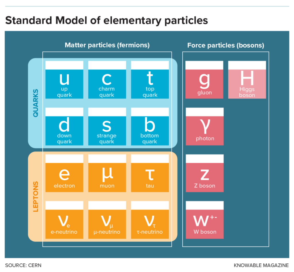 It’s pretty simple to draw a chart displaying those particles. You need 12 spots for matter particles — six quarks and six leptons. You need four spots for force particles (collectively known as bosons) plus a spot for the Higgs boson, a particle needed to explain why some particles have mass. But the mathematics underlying the chart is unfathomably complex, a combination of equations that make hieroglyphics seem self-explanatory.
