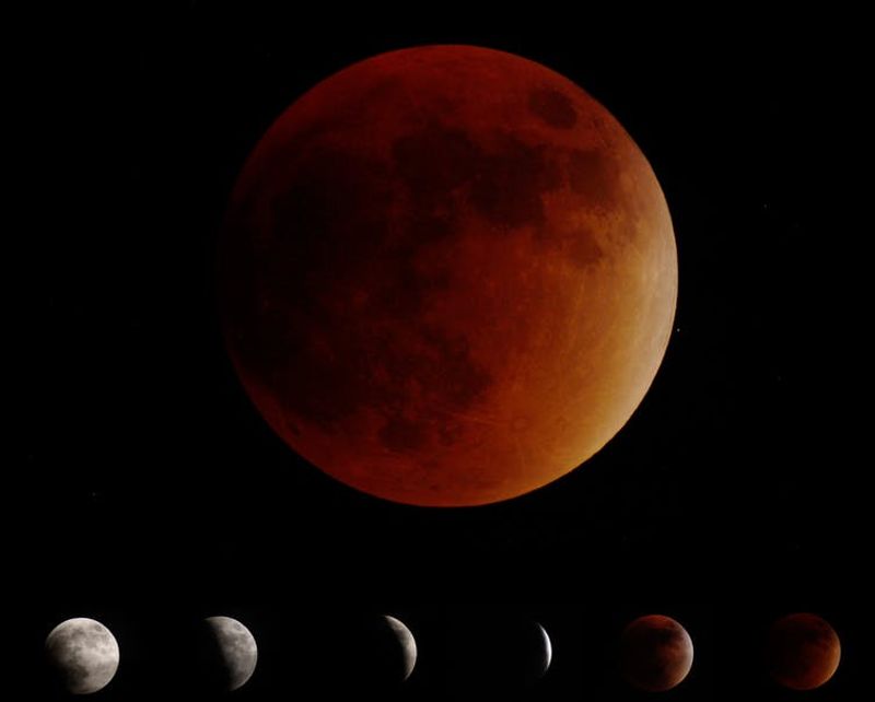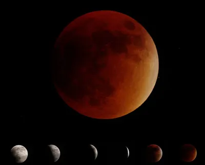 Image depicting the various phases of a lunar eclipse. Credit: Patrick Murtha/wikipedia, CC BY-SA