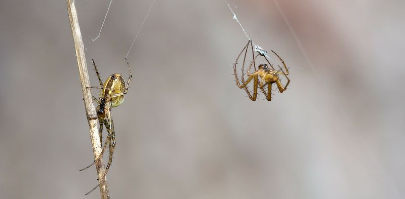 Males also use their silk in another way: they are among the only few species that offer nuptial gifts of prey wrapped in dense layers of silk to females, to be eaten during copulation.
