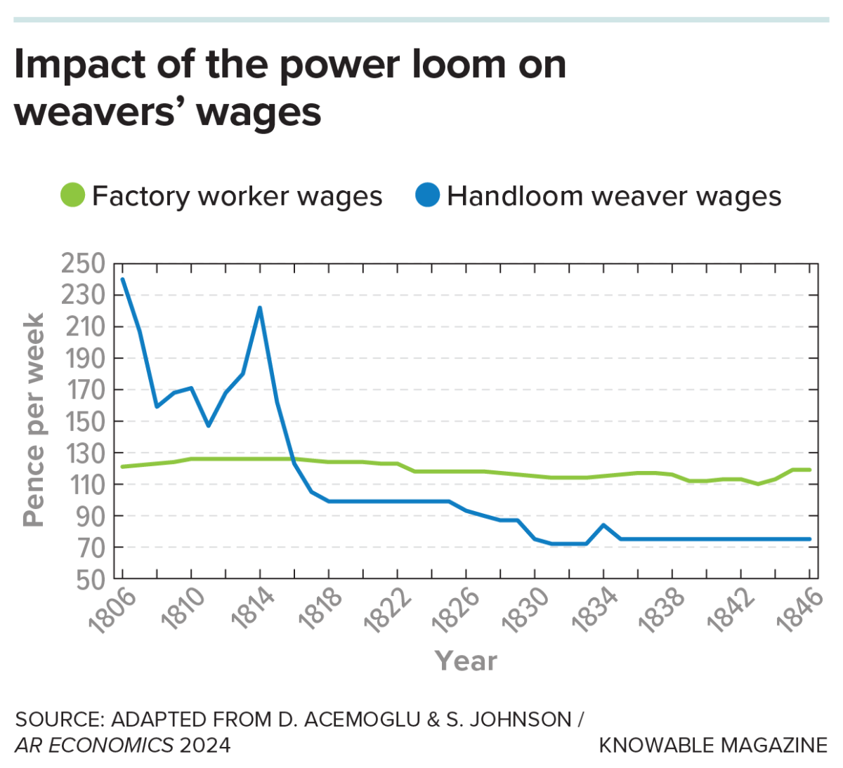 Handloom weaver wages plummeted after the advent of power looms. Wages for factory workers were not high and did not see growth in the early 1800s. (Numbers shown are nominal wages, not adjusted for inflation or changes in the cost of living.) Photo: Knowable Magazine