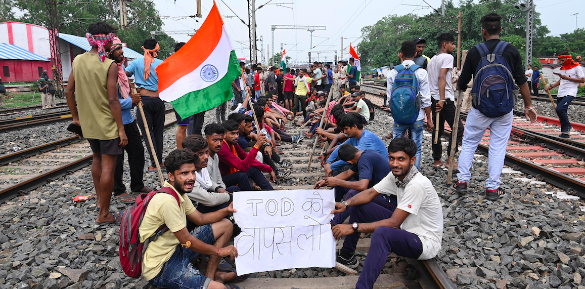 Youngsters block railway tracks in protest against the Centre's Agnipath scheme, in Dhanbad, Friday, June 17, 2022. Photo: PTI