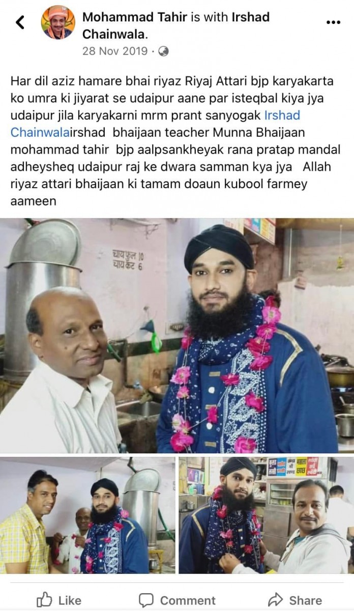 Another of Tahir's posts shows Attari with Ravindra Shreemali, head of the BJP in Udaipur. Tahir identifies Attari by name.