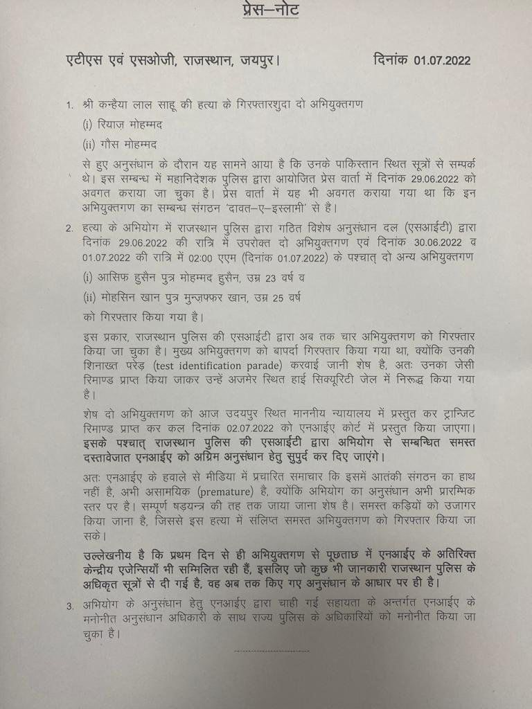 Rajasthan Police press note, July 1, 2022.