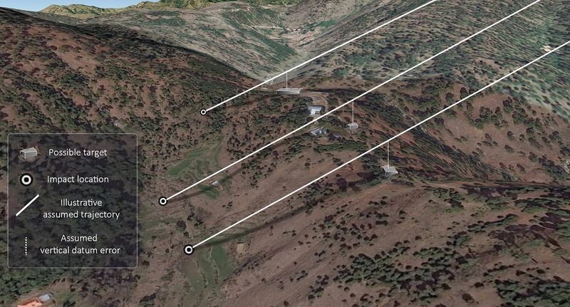 The image below correlates the identified impact sites, the buildings that were the likely targets and a discrepancy between ellipsoidal and orthometric height which we have assumed to equate to 33 metres above the target buildings. Presented in 3D, this correlation results in consistent, parallel trajectories indicating a consistent targeting error. The differences in the impact distances from the intended targets are accounted for by the steep terrain and the differences in elevation between the impact sites. While this diagram does not necessarily represent the actual trajectories of the missiles, it does suggest a systematic targeting error caused by the use of different vertical datums.