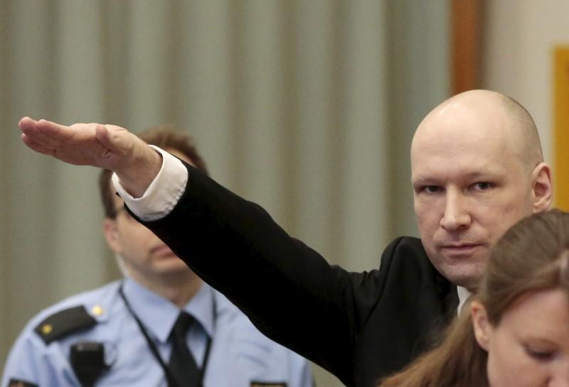 Mass killer Anders Behring Breivik raises his arm in a Nazi salute as he enters the court room in Skien prison, Norway March 15, 2016. Credit: Reuters/Lise Aserud/NTB Scanpix