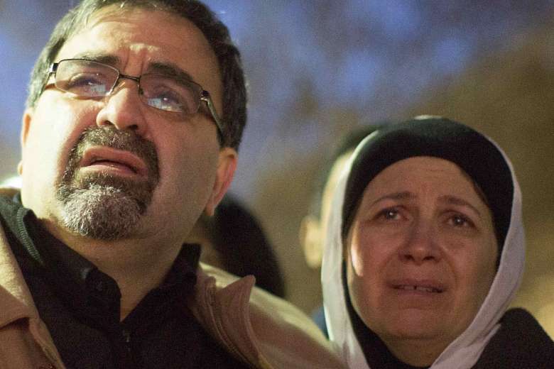 Namee Barakat and his wife Layla Barakat, parents of shooting victim Deah Shaddy Barakat, react as a video is played during a vigil on the campus of the University of North Carolina in Chapel Hill, North Carolina Feb 11, 2015. Credit: Reuters
