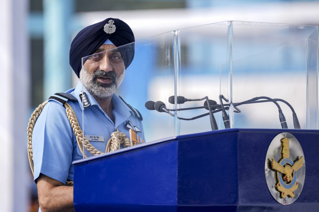 Chief of the Air Staff Air Chief Marshal A. P. Singh addresses the gathering during the 93rd Indian Air Force Day celebrations, at Hindon Air Force Station, in Ghaziabad, Wednesday, Oct. 8, 2025. Photo: PTI