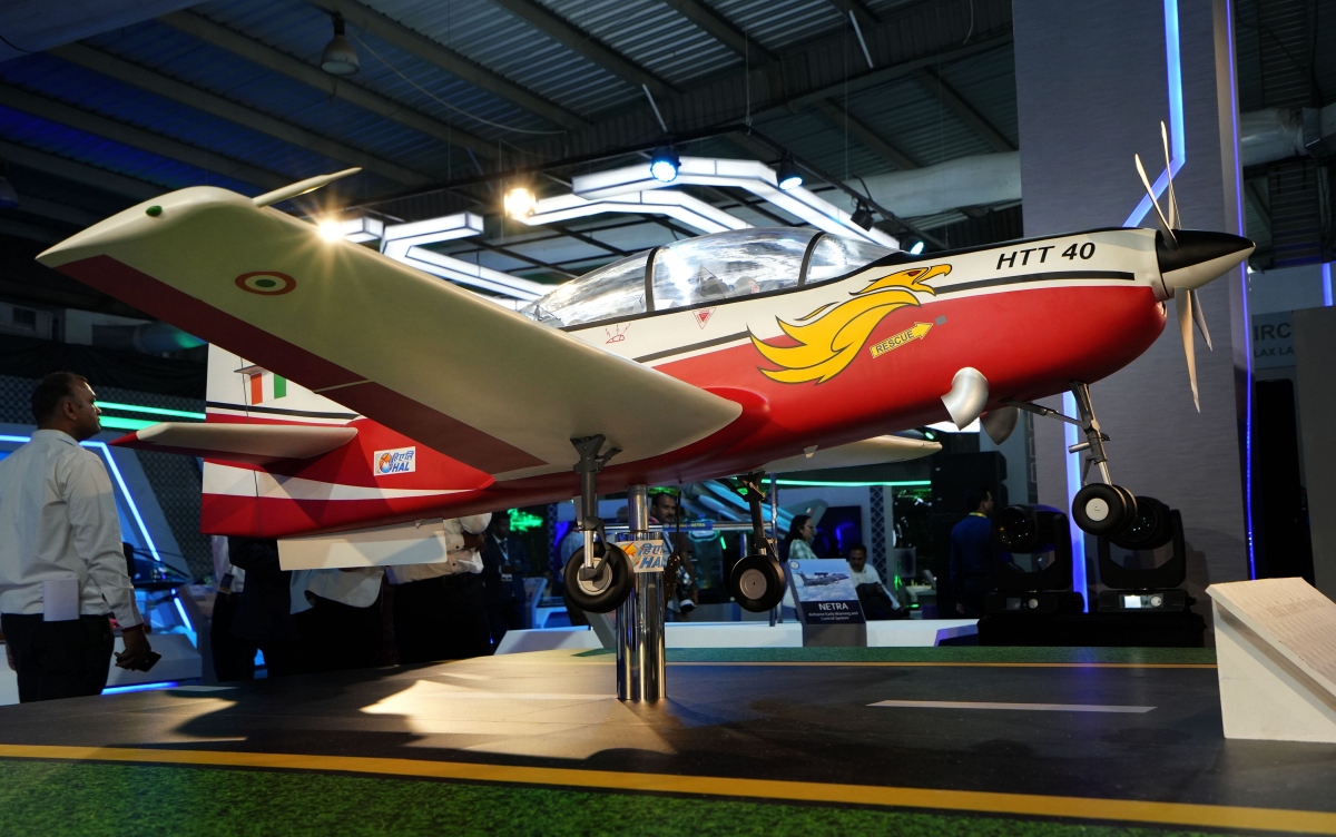 An exhibit of the indigenous trainer aircraft HTT-40 (Hindustan Turbo Trainer-40) designed by HAL on display during the 12th edition of DefExpo, in Gandhinagar, October. 19, 2022. Photo: PTI/Atul Yadav