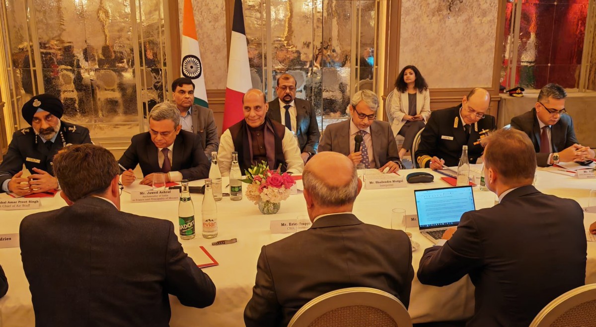 Rajnath Singh with the CEOs of the top French defence companies including Eric Trappier, CEO of Dassault, Pierre Eric Pommellet, CEO of Naval Group, Guillaume Faury, CEO of Airbus, and Olivier Andries, CEO of Safran Group.