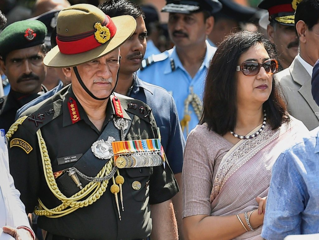 In this file image dated September 18, 2017, Army Chief General Bipin Singh Rawat and his wife Madhulika Rawat are seen at Arjan Singh at Brar Square in New Delhi. Photo: PTI/Kamal Singh