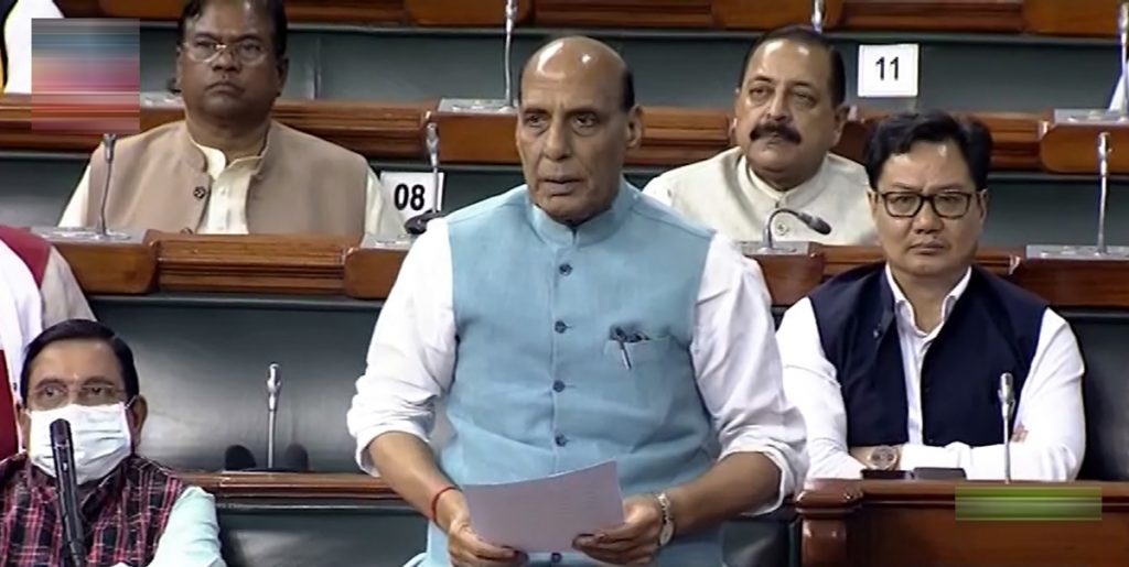 Union defence minister Rajnath Singh speaks in the Lok Sabha during the second part of the Budget Session of Parliament, in New Delhi, March 15, 2022. Photo: SANSAD TV screengrab via PTI