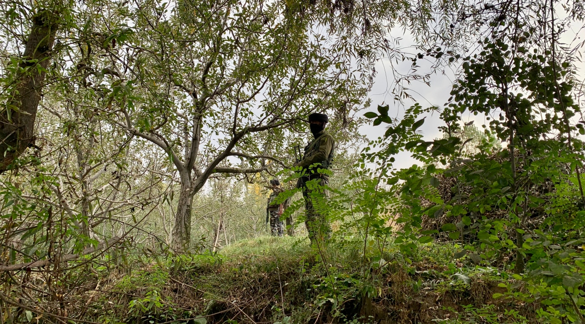 Security officers search apple orchards for the attackers who killed two migrant workers in Shopian district of Jammu and Kashmir, October 18, 2022. Photo: Jehangir Ali