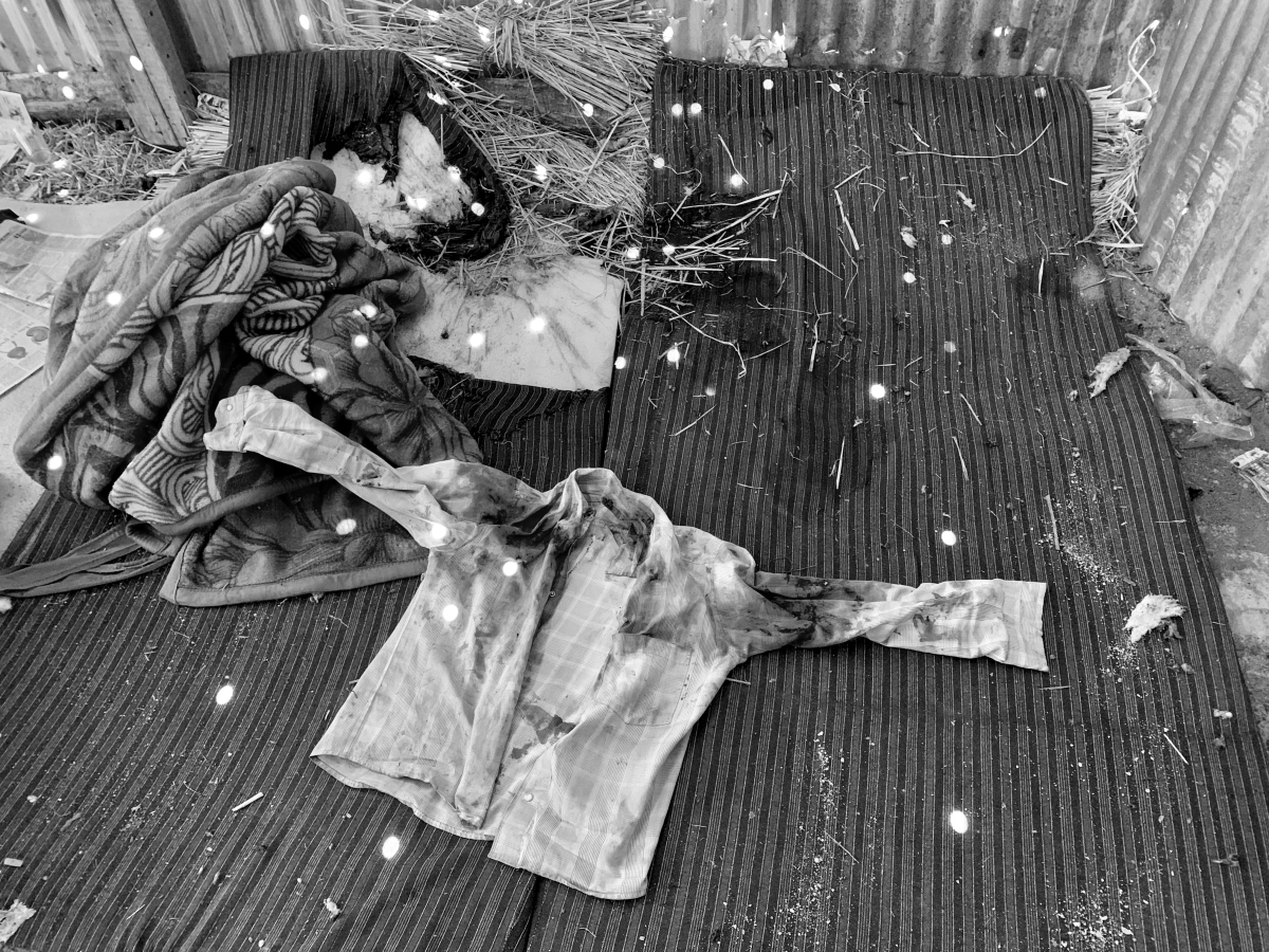 Inside the shed, a shirt and a stole belonging to the two men lie on a thin, nylon-and-jute sheet, which they used as a mattress for sleeping. The grenade appears to have exploded between the two men, tearing apart the sheet which is also smeared with blood. The impact of the explosion, which shook the neighbourhood, is also visible on the concrete slab.