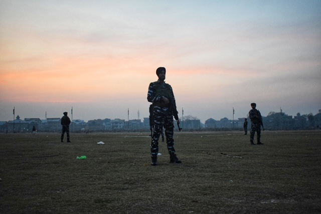 CRPF personnel stepped up vigil in and around the site of the shooting of a police inspector in Eidgah ground on Sunday evening. Photo: Ubaid Mukhtar.